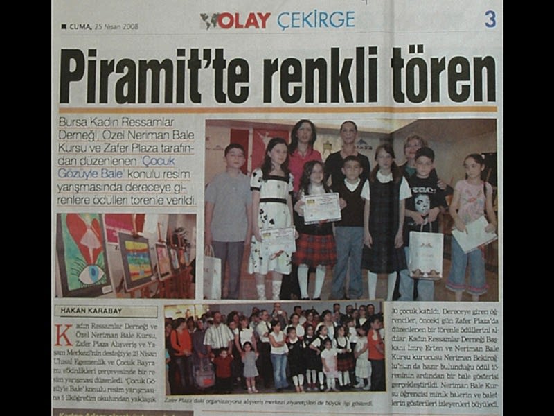 Piramit’te renkli tören Bursa Kadın Ressamlar Derneği ,Özel Neriman Bale Kursu ve Zafer Plaza tarafından düzenlenen ‘Çocuk Gözüyle Bale’ resim yarışmasında dereceye girenlere ödülleri törenle verildi.
