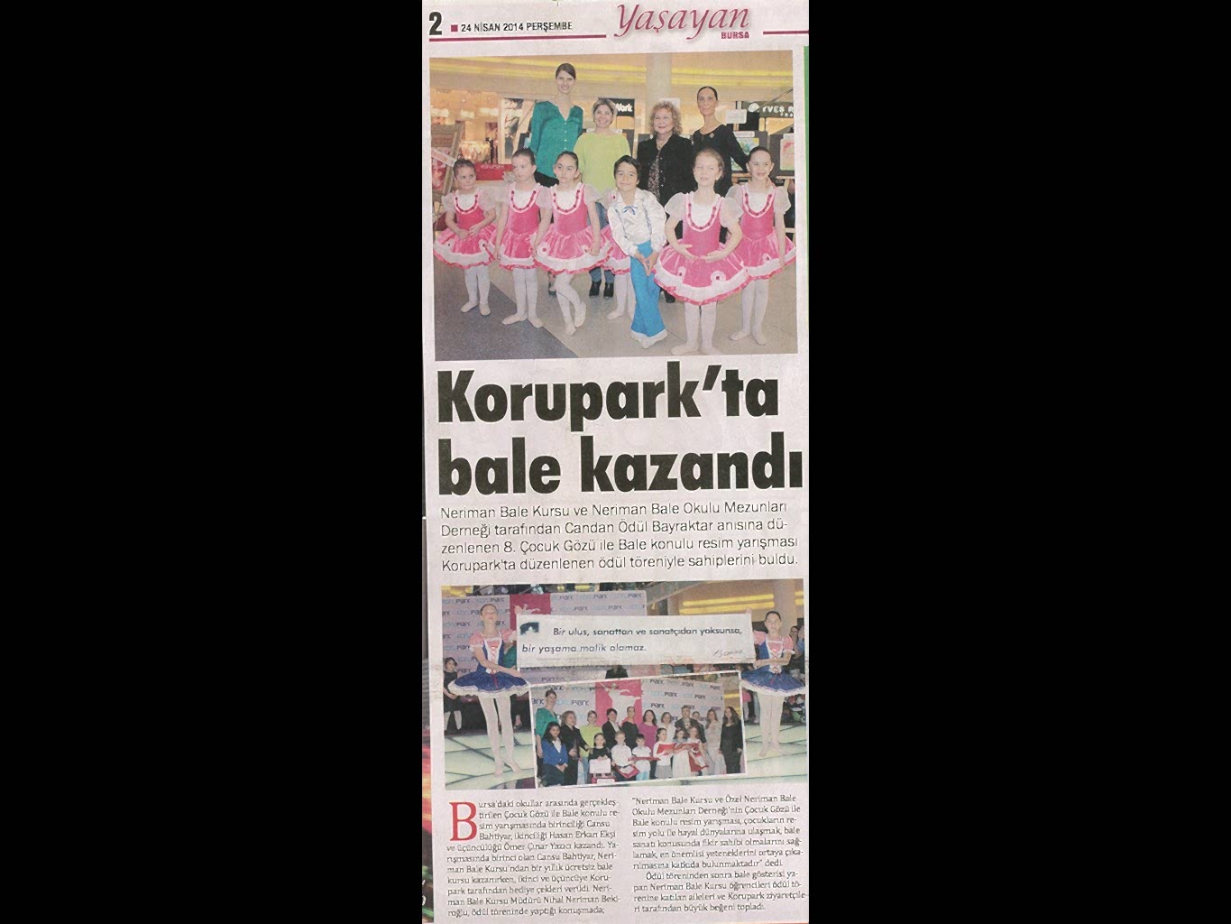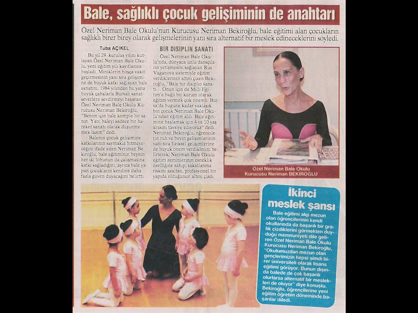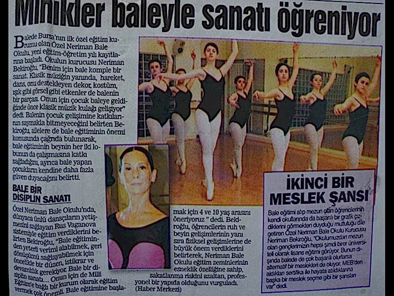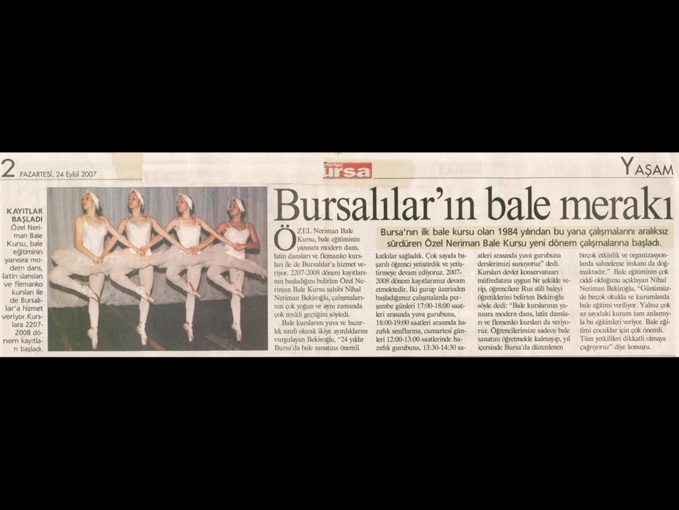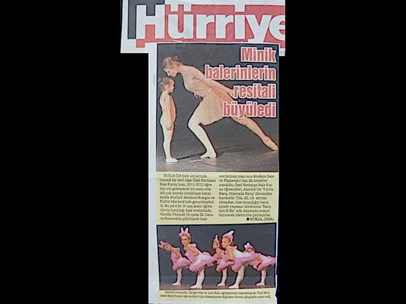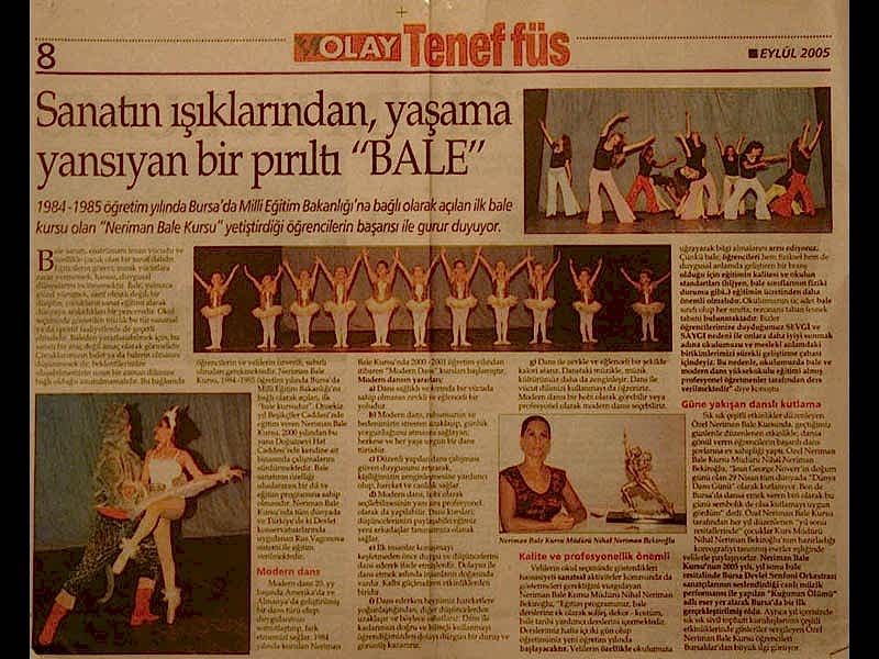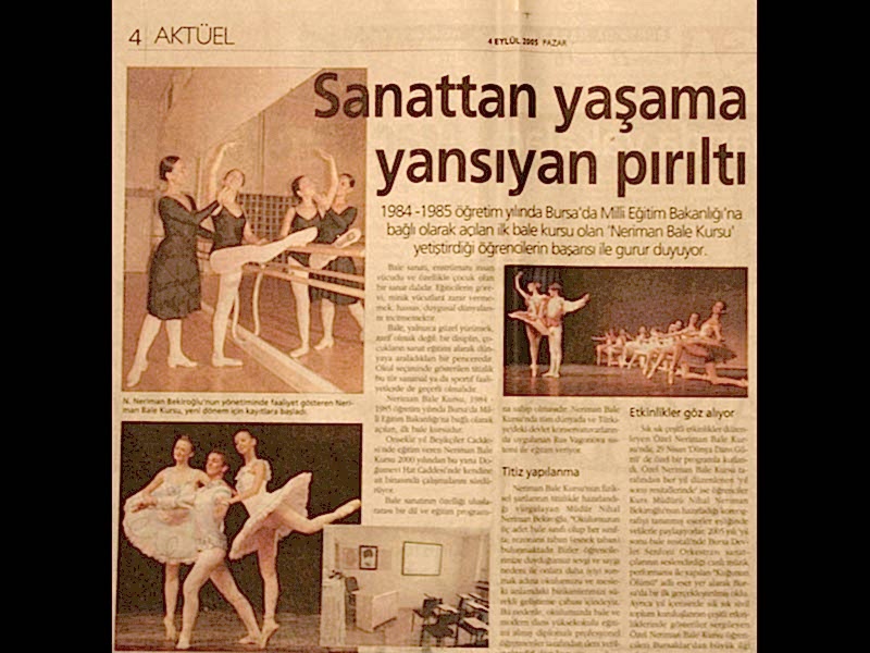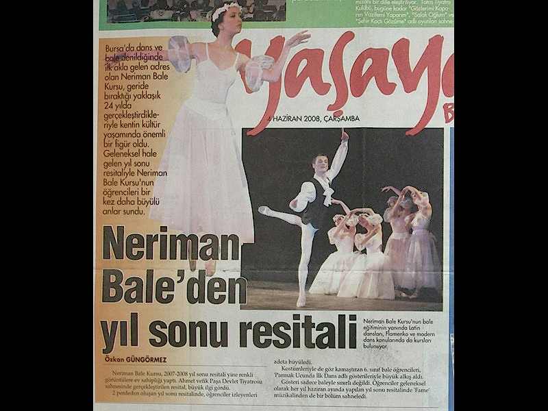 Sanattan yaşama yansıyan pırıltı... 1984-1985 öğretim yılında Bursa’da Milli Eğitim Bakanlığı’na bağlı olarak açılan ilk bale kursu olan ‘Neriman Bale Kursu’ yetiştirdiği öğrencilerin başarısı ile gurur duyuyor.