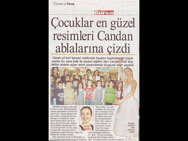 Çocuklar en güzel resimlerini Candan ablalarına çizdi Geçen yıl lenf kanseri nedeni ile hayatını kaybeden ve küçük yaştan buyana bale ve piyano eğitimi alan Candan Ödül Bayraktar anısına açılan resim yarışmasında duygusal anlar yaşandı.