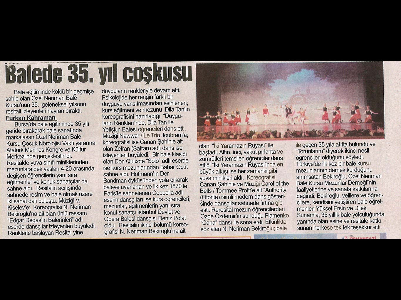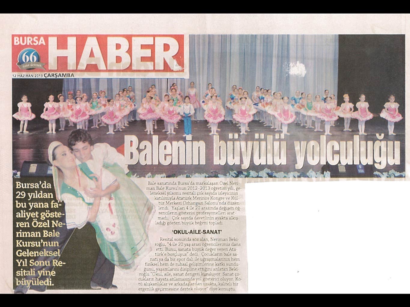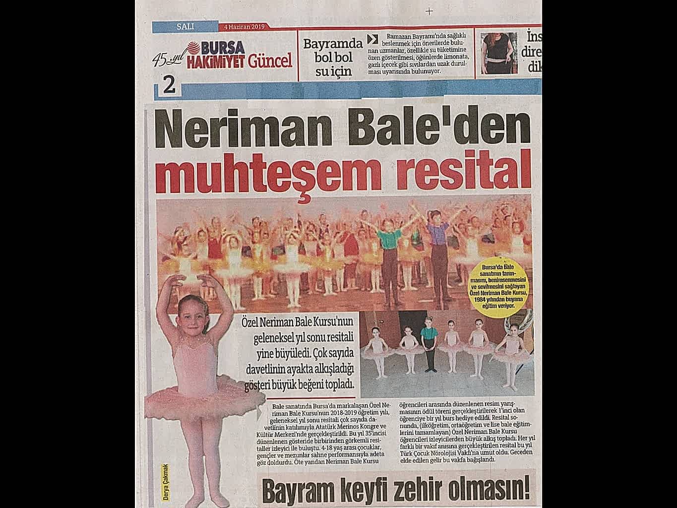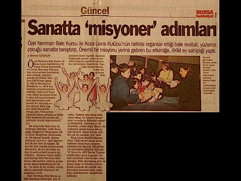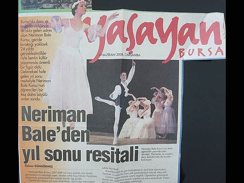 Sanatın ışıklarından, yaşama yansıyan bir pırıltı ‘Bale’… 1984-1985 öğretim yılında Bursa’da Milli Eğitim Bakanlığı’na bağlı olarak açılan ilk bale kursu olan ‘Neriman Bale Kursu’ yetiştirdiği öğrencilerin başarısı ile gurur duyuyor